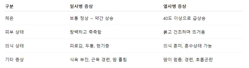 열사병과 일사병의 차이를 정확하게 구분해야 상황 파악 및 대처가 가능합니다.