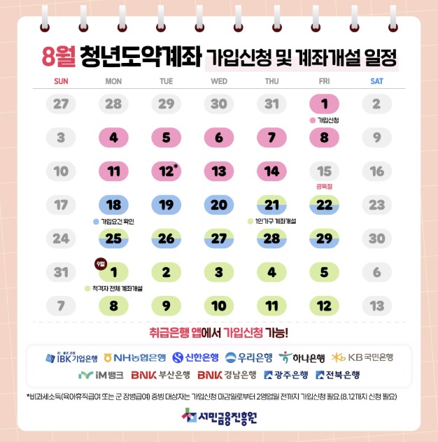 8월 청년도약계좌 신청기간은 8월 14일까지이며 계좌개설은 9월 12일까지 완료해야합니다.