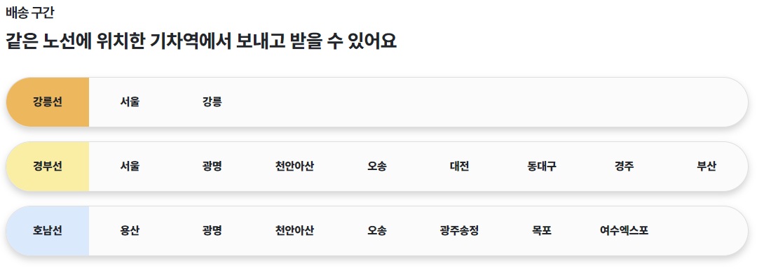 - 코레일 직원이 직접 열차에 탑재하고, 도착역에서 수취인이 수령합니다.