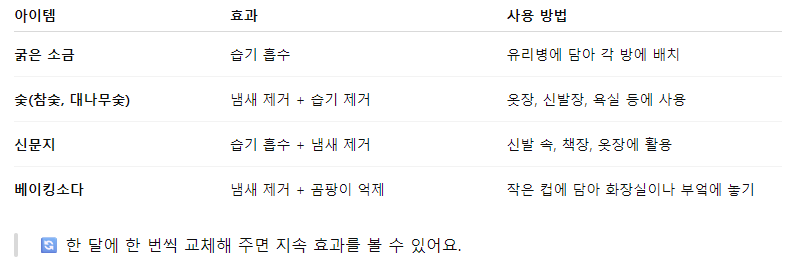 - 소금이나 숯 활용: 그릇에 소금을 담아 TV장, 책장 등에 놓으면 자연 제습 효과