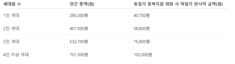 - 4인 이상 가구는 연간 701,300원, 필요시 하절기만 102,000원