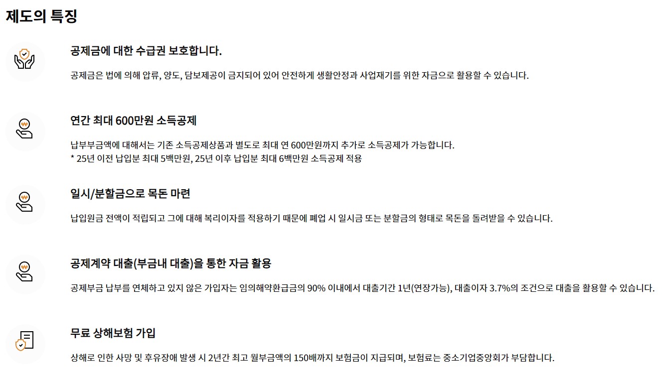 소득공제 혜택, 압류방지 통장, 이자소득 비과세 등의 다양한 혜택이 있어 자영업자 사이에서 매우 인기 있는 제도죠.
