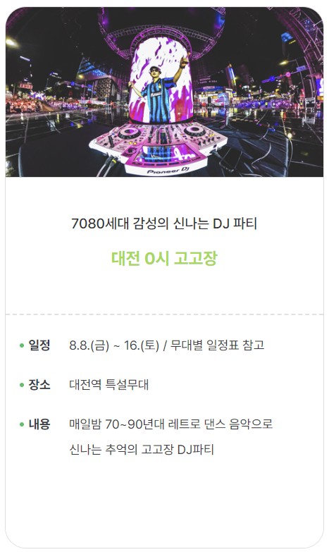 ‘2025 대전 0시 축제’는 8월 8일(금)부터 16일(토)까지 9일간 대전 중구 원도심, 특히 대전역~옛 충남도청 구간의 중앙로 일대에서 개최되는 축제로 많은 사람들에게 주목받고 있는 큰 행사입니다.