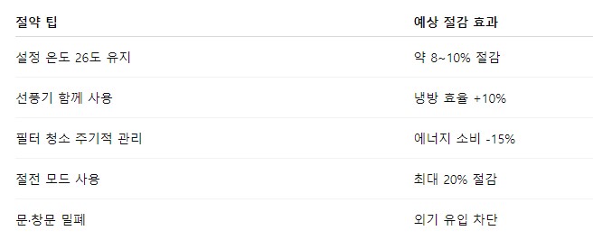 🔹 에어컨 설정 온도를 1도 올릴 때마다 약 6~8%의 전기요금 절감 효과가 있습니다.